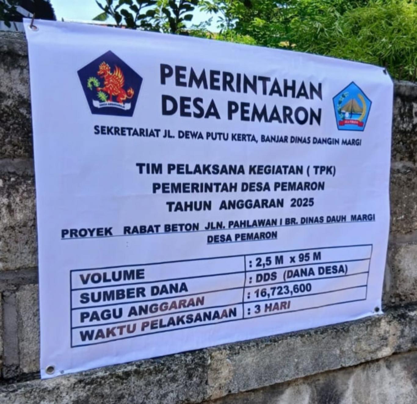 Pemerintah Desa Pemaron berkomitmen menyediakan fasilitas publik yang layak. Setiap proyek fisik diwajibkan memasang papan informasi proyek sebagai bentuk keterbukaan informasi.